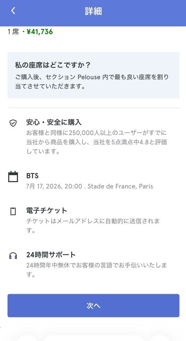特に「チケット形態」「受け取り方法」が日本語で記載されているほか、「入場に関する特別な条件」がある場合は、日本語で併記されているか、事前に日本語で質問することができるため、後から「実はリセールサイトで購入不可の席だった」といったトラブルに巻き込まれる心配もありません。