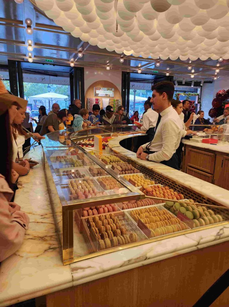 特にシャンゼリゼ通りの店舗は最近リニューアル工事が完了し、造花やシャンデリア、綺麗な色のソファーで飾られ、とても可愛いです。