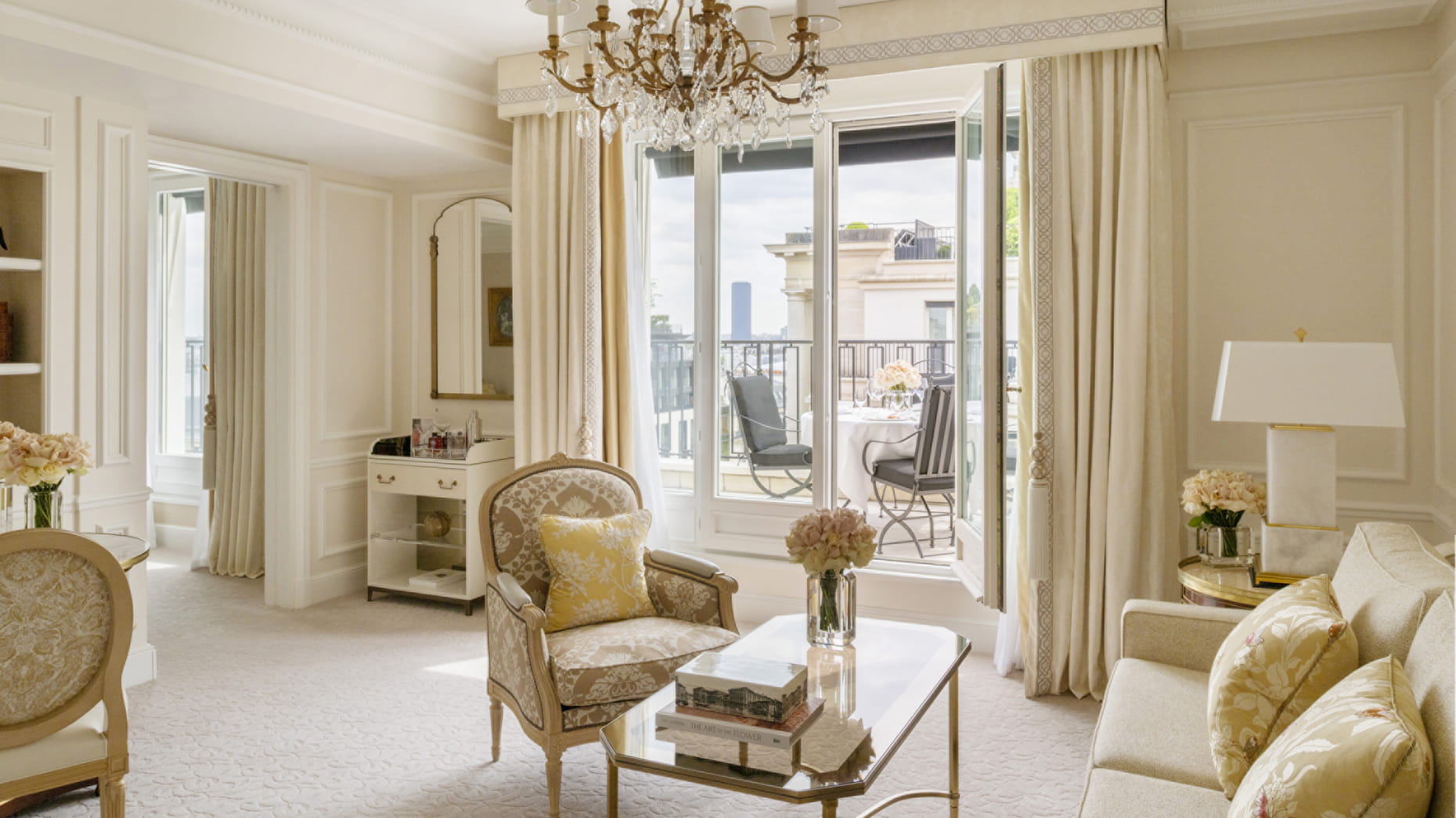 モンテーニュ通りの並木道に映える、象徴的な「赤いオーニング(日よけ)」とゼラニウムの花。1913年の開業以来、多くのセレブリティやファッショニスタに愛されてきた名門です。 『セックス・アンド・ザ・シティ』などの映画やドラマの舞台としても有名で、一部の客室からはバルコニー越しにエッフェル塔を独り占めできる、まさにハネムーンのための絶景が広がります。