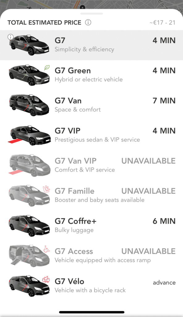 また、乳幼児を同乗させる場合、G7だとチャイルドシート付のファミリー車両を選択できますが、他のアプリだと選択できないため、(Uberにはファミリー車両があると記載があるが、見つけられず)要注意です。(フランスではチャイルドシートがないと違法。)
